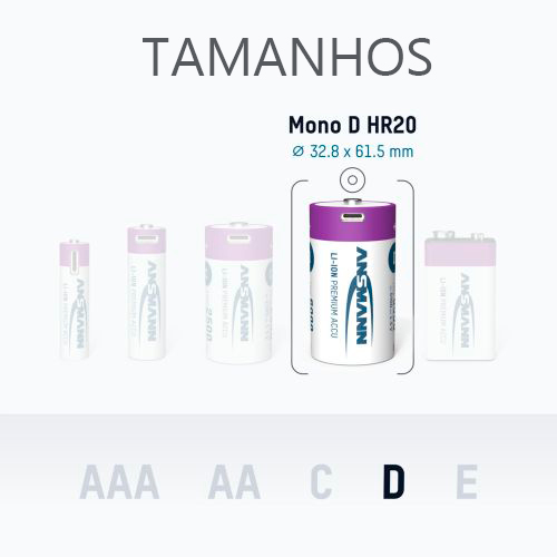 Peso: Variável, geralmente mais leve que baterias D alcalinas equivalentes