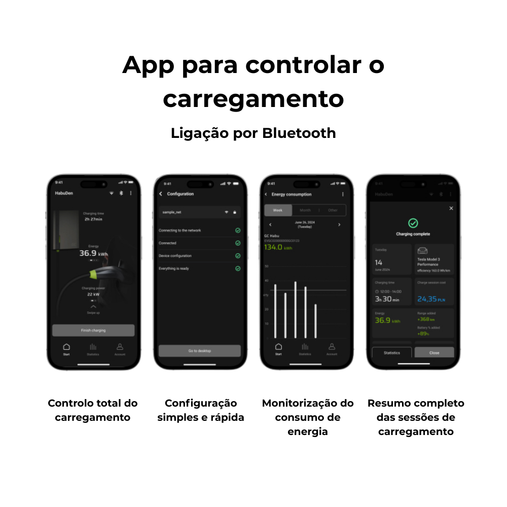 Através da aplicação móvel pode controlar todo o processo de carregamento de forma simples: iniciar e parar o carregamento, definir horários, monitorizar consumos e gerir melhor a energia. A ligação é feita por Bluetooth ou Wi-Fi, garantindo comodidade total no dia a dia.