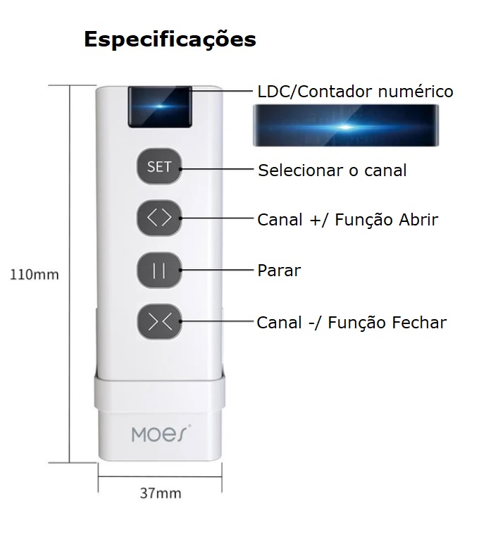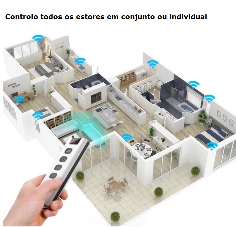 Comando emissor para iluminação ou persianas. Permite controlar 9 módulos de estores ou vários em simultâneo. Até 27 canais independentes de iluminação ou vários em conjunto. Pequeno visor no comando para visualizar o canal.