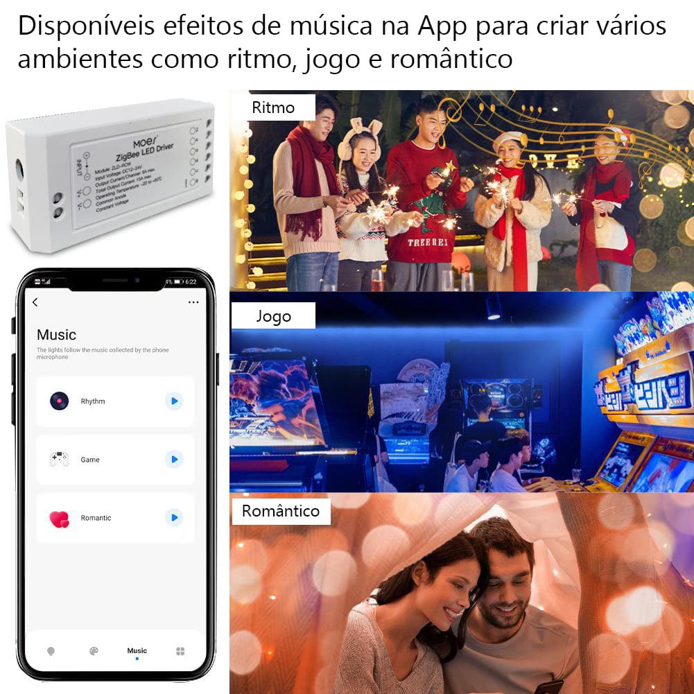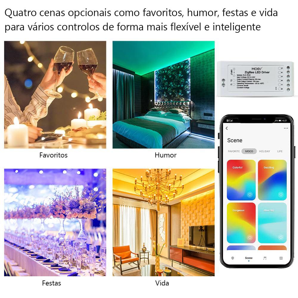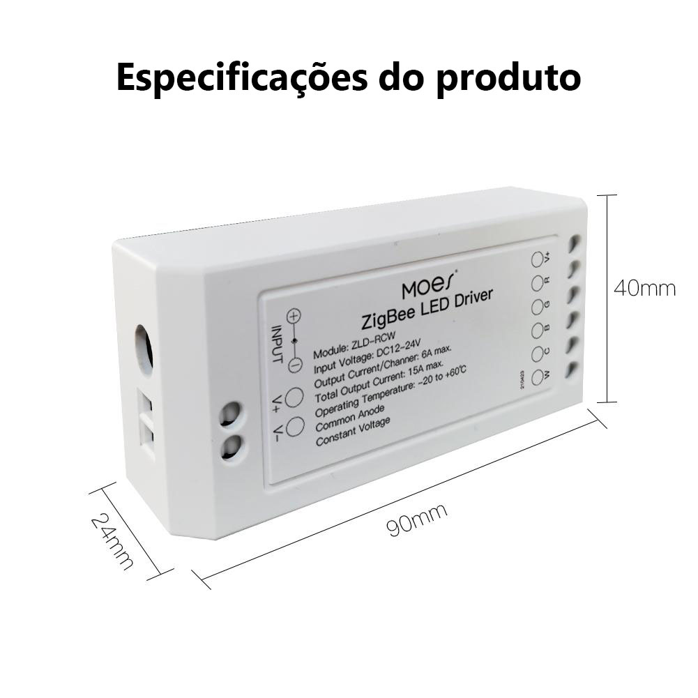 Controlador ZigBee para Fita LED RGB+CCT. Pode conectar: RGB W / WW / RGBW / RGBWW. Funcionamento a 12/24V (não inclui adaptador). Necessita do Gateway Tuya ZigBee para funcionar. Sincroniza com o som de música podendo ser instalado atrás de uma TV. Conecta com gateways Tuya, e ainda com Smartthings. Suporta controlo por voz com Alexa e Google Home.