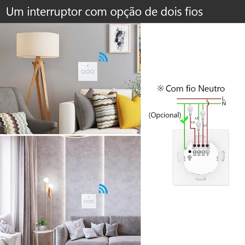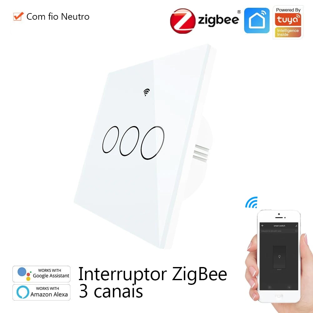 Interruptor touch para ligar/ desligar as luzes, 10A. Controlo através da APP Smart Life, permite criar cenários com outros dispositivos tuya, horários e agendamentos. Necessita de um hub Zigbee para funcionar e fio neutro. Funciona com Alexa e Google Home.