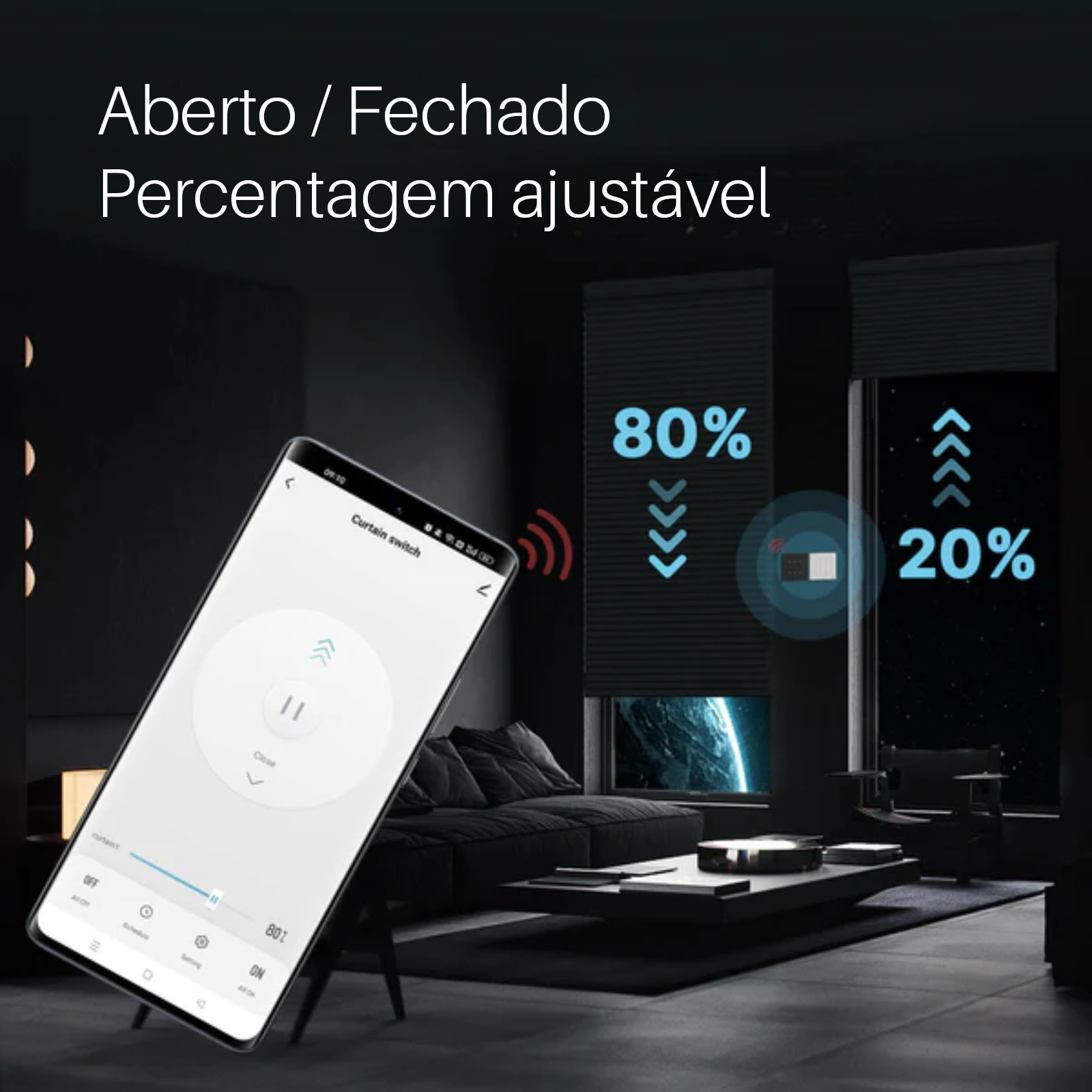 Interruptor de teclas para sobe, desce e pausa com botões retroiluminados. Controlo através da APP Smart Life para criar cenários com outros dispositivos Tuya. Permite defenir horários de abertura e fecho e configurar até 30 períodos em simultâneo. Definição de percentagem de abertura/fecho ajustável na APP. Funciona com Alexa e Google Home.