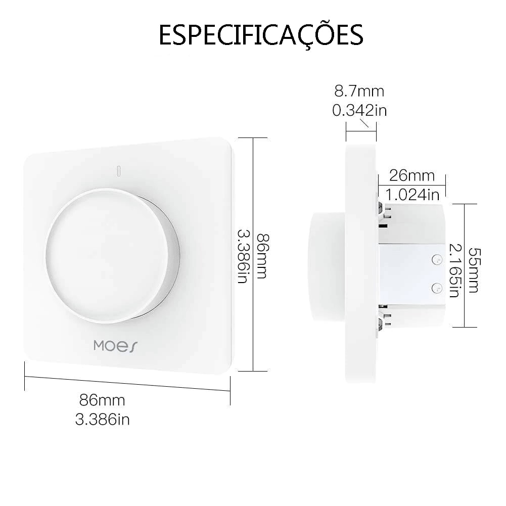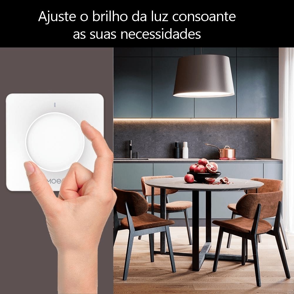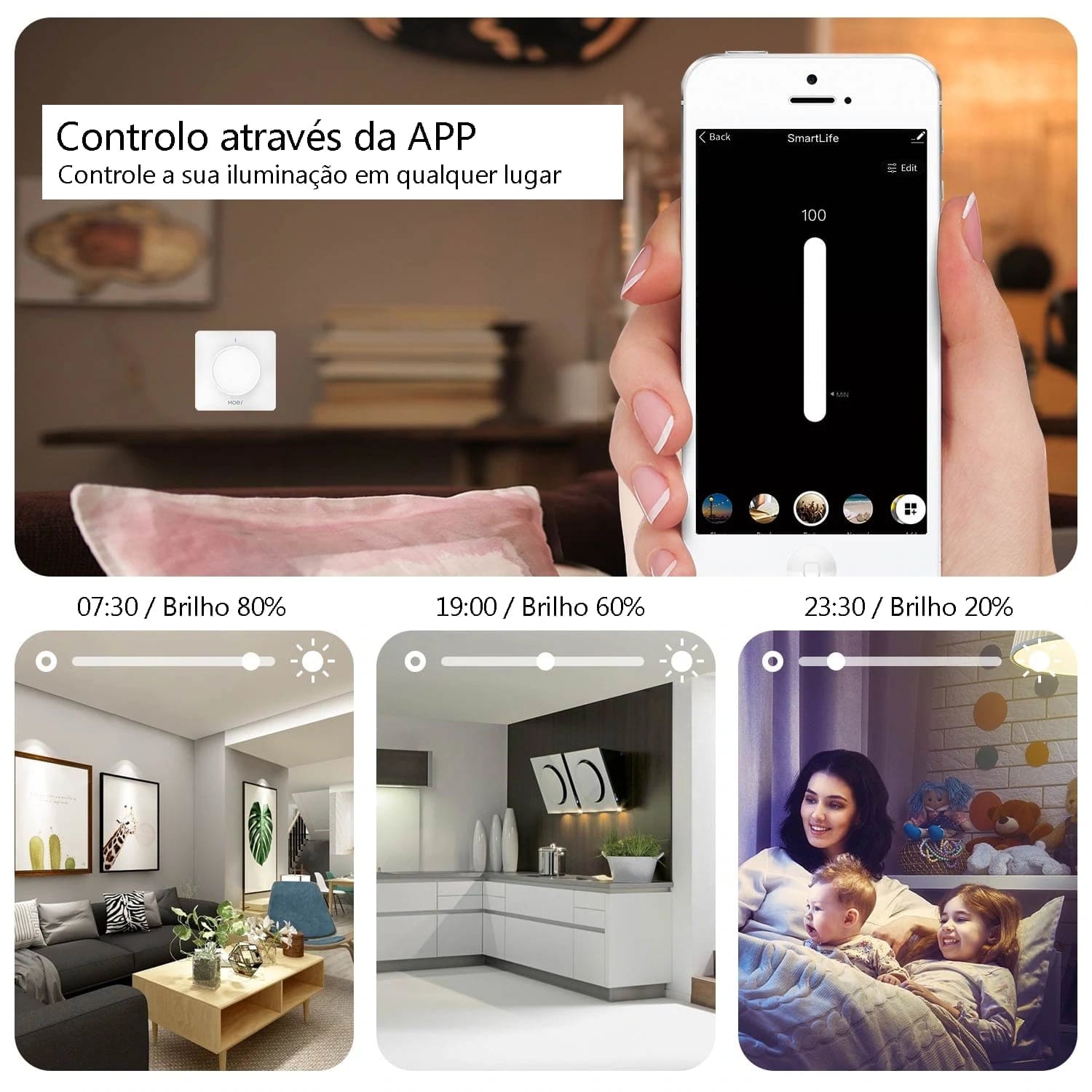 Interruptor dimável para regular a iluminação. Permite ajustar a luminosidade conforme a necessidade Controlo local, por voz e através da APP Smart Life/ Tuya. É possível criar temporizadores automáticos e cenários com outros dispositivos tuya. Funciona com lâmpadas dimáveis, LED e incandescentes
