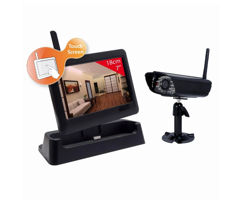 Kit composto por uma câmara e monitor com bateria para transportar dentro de casa.