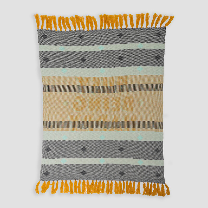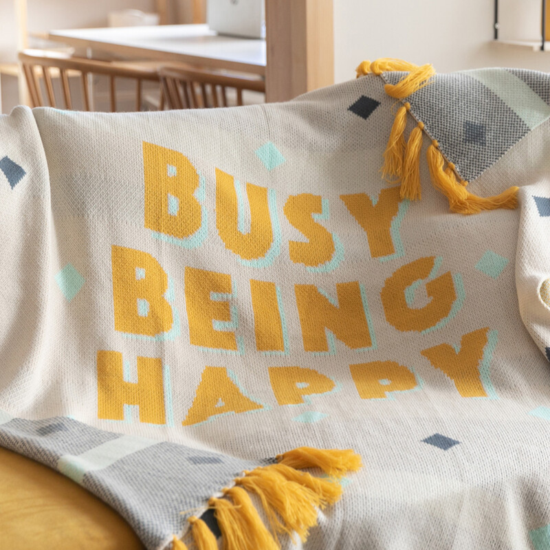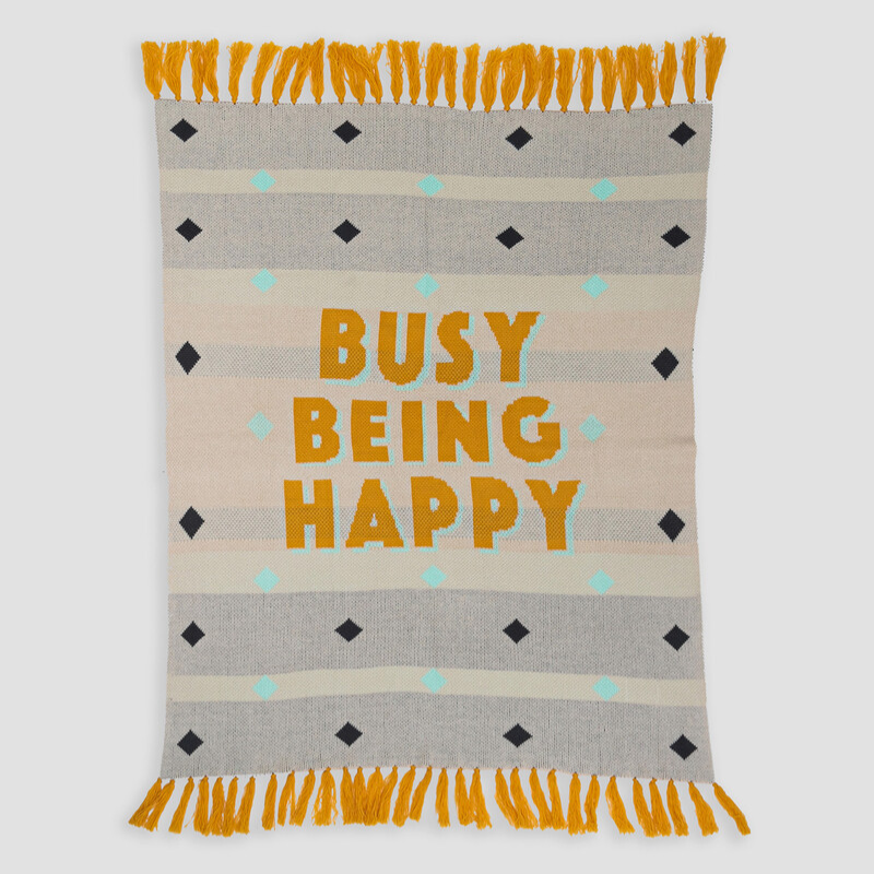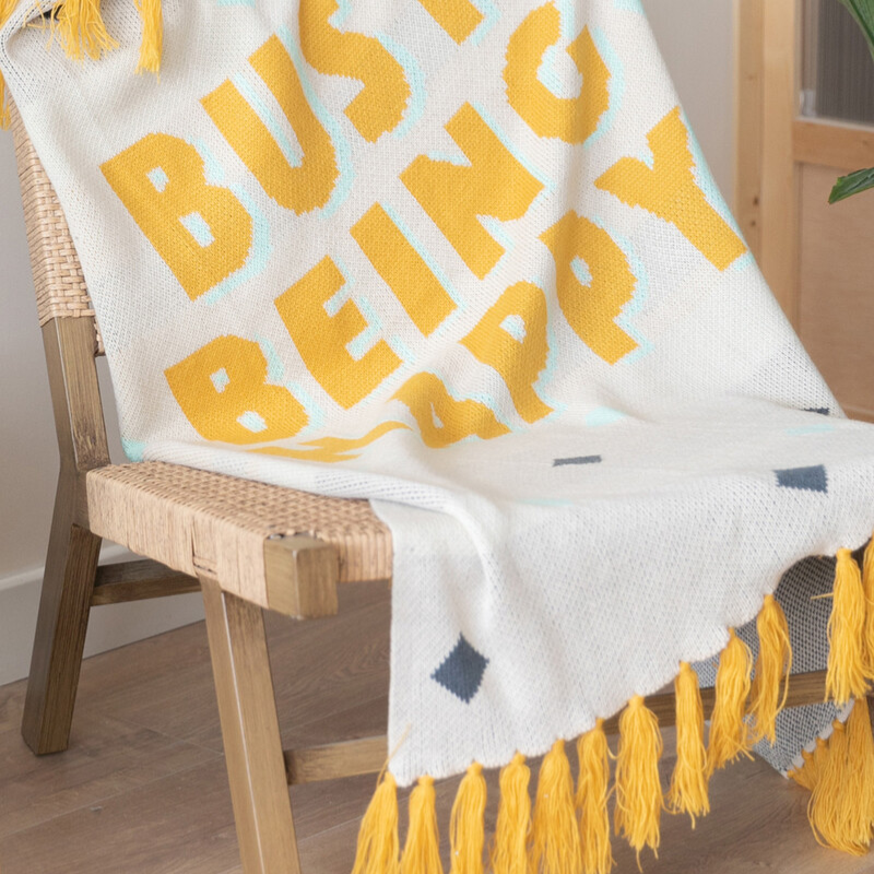 Mergulha no teu momento favorito do dia com a manta “Busy Being Happy” – feita em jacquard macio, com um toque muito agradável e franjas que adicionam estilo e originalidade. Perfeita para relaxares no sofá com conforto e boa disposição.