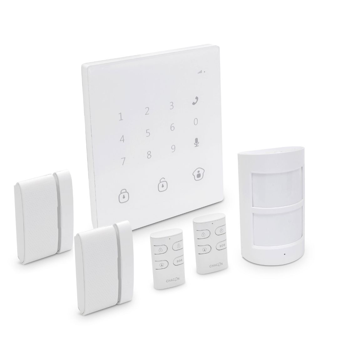Entregue com 2 telecomandos, 2 sensores de abertura de porta/janela, 1 sensor de movimento especial para animais <20 Kg